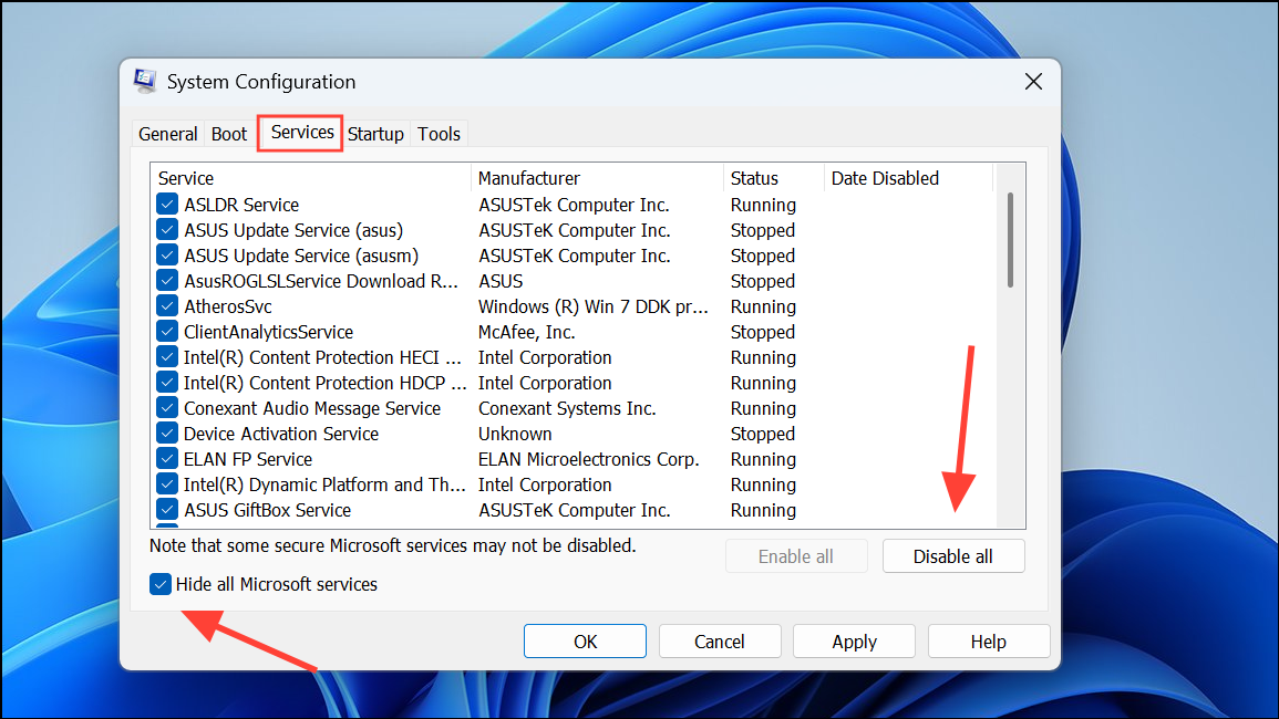 Step 2: Go to the Services tab, check Hide all Microsoft services, then click Disable all to turn off third-party services.