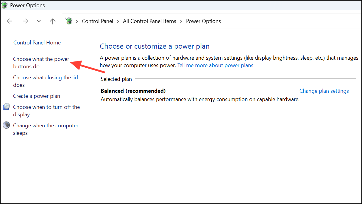 Step 2: Select Power Options, then click Choose what the power buttons do from the sidebar.