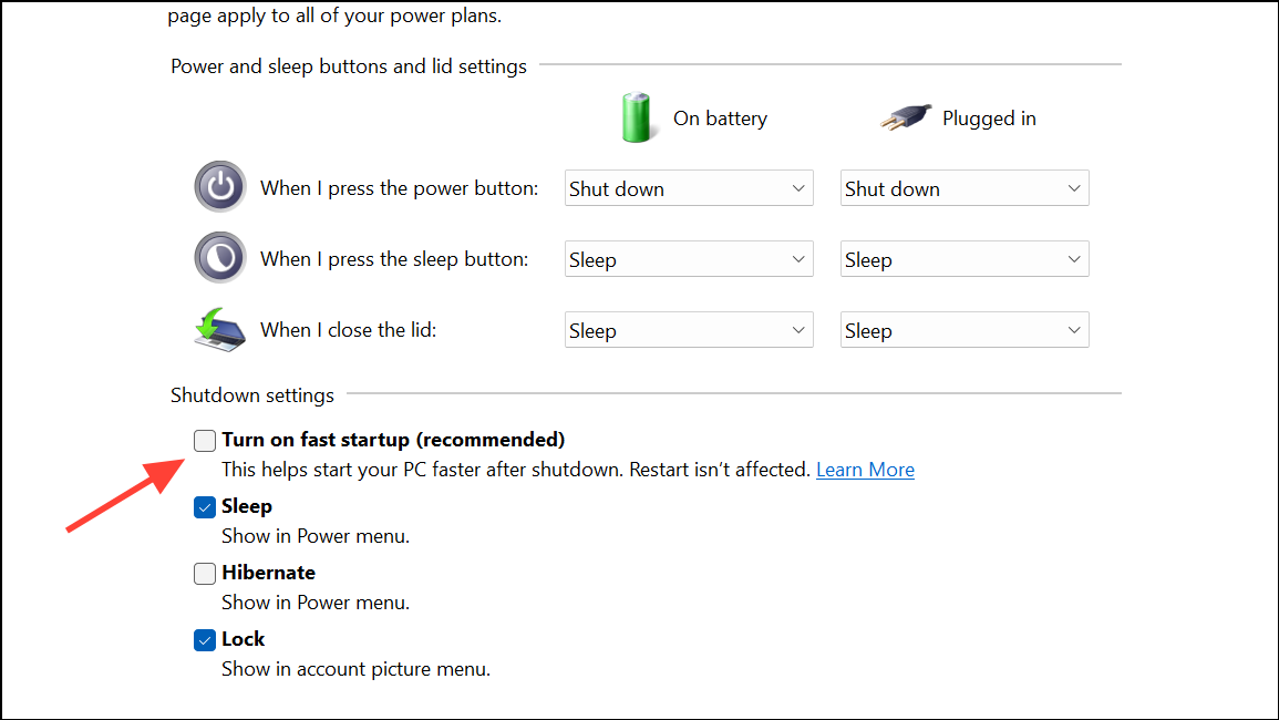 Step 4: Under Shutdown settings, check or uncheck Turn on fast startup (recommended) as needed. If you experience issues with Fast Startup enabled, try disabling it and restarting your PC to see if boot times improve.