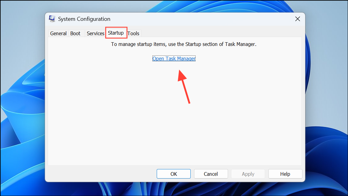 Step 3: Switch to the Startup tab and click Open Task Manager. In Task Manager, disable all non-essential startup apps.