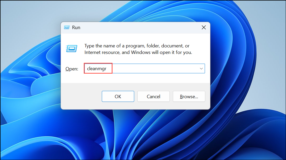 Step 1: Press Windows key + R, type cleanmgr, and press Enter.