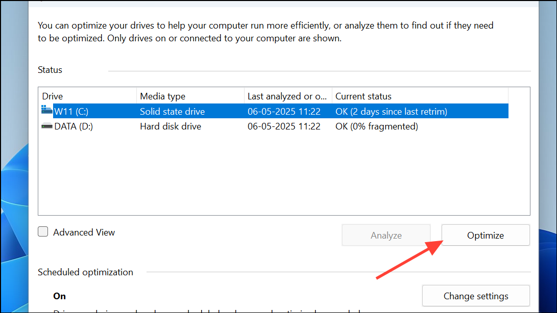 Step 2: Select your system drive and click Optimize. For SSDs, this process is called "retrim" and is safe to perform.
