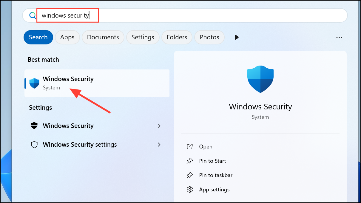 Step 1: Open Windows Security from the Start menu or by searching for it.