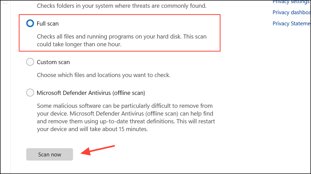 Step 3: Select Full scan and click Scan now. Allow the scan to complete and follow any prompts to remove detected threats.