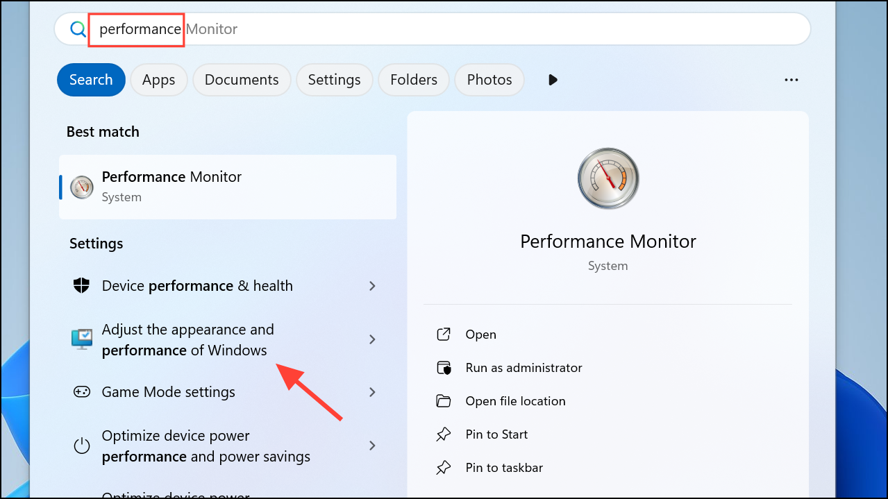 Step 1: Search for performance in the Start menu and select Adjust the appearance and performance of Windows.