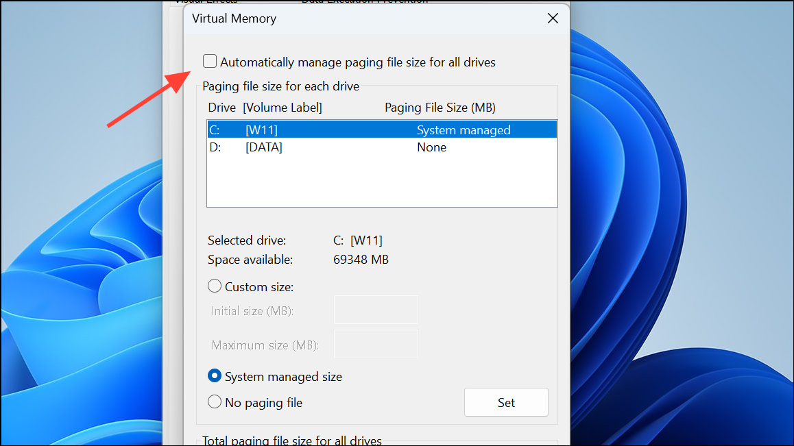 Step 3: Uncheck Automatically manage paging file size for all drives.