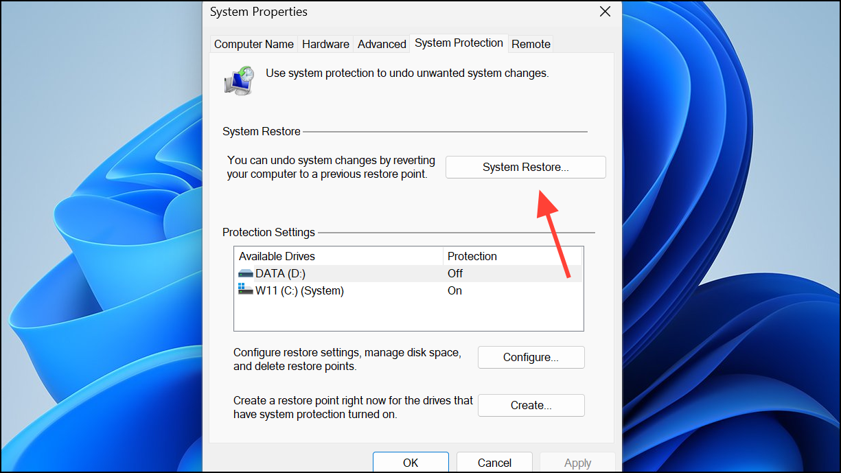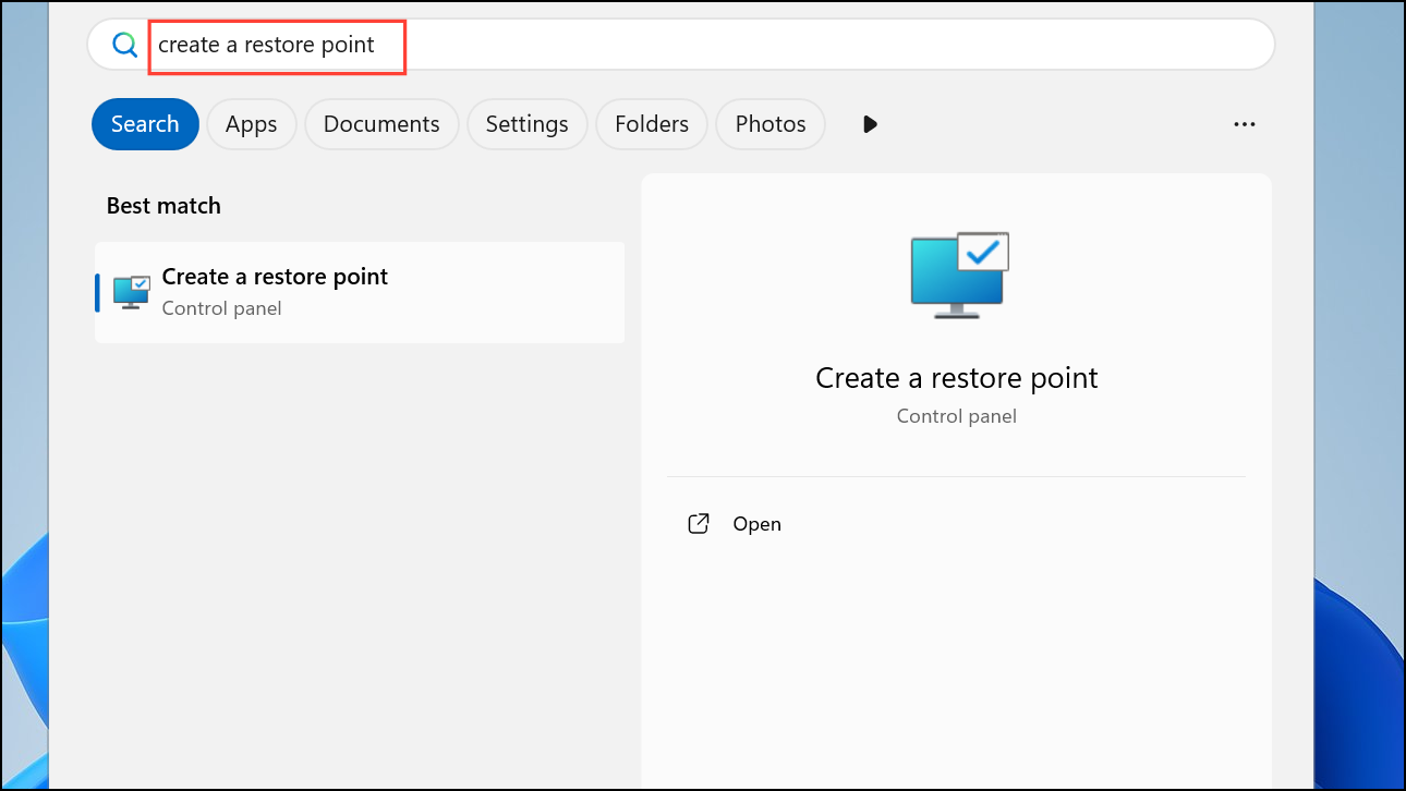 Step 1: Press Windows Key + S, type create a restore point, and press Enter.