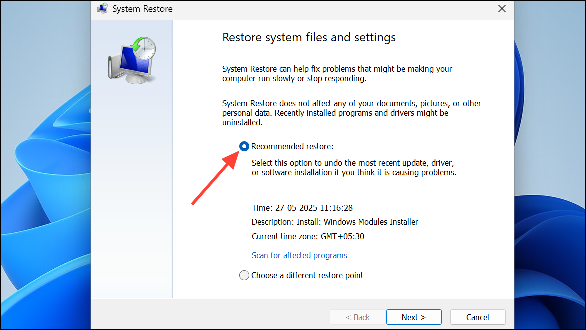 Step 3: Click Next, then select a restore point created before the error appeared. Follow the prompts to complete the restoration. Your PC will restart during this process.