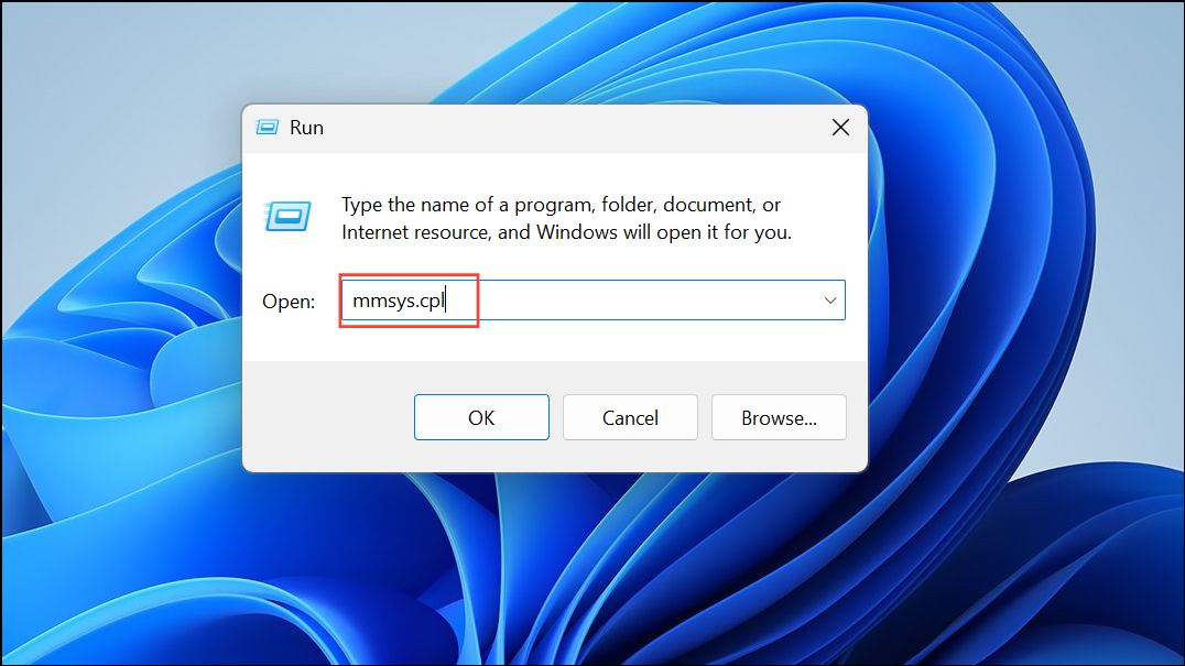 Step 1: Press Windows Key + R, type mmsys.cpl, and press Enter to open the Sound settings.