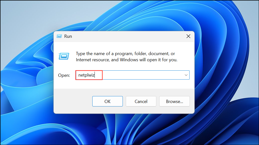 Step 1: Press Windows Key + R, type netplwiz, and press Enter.
