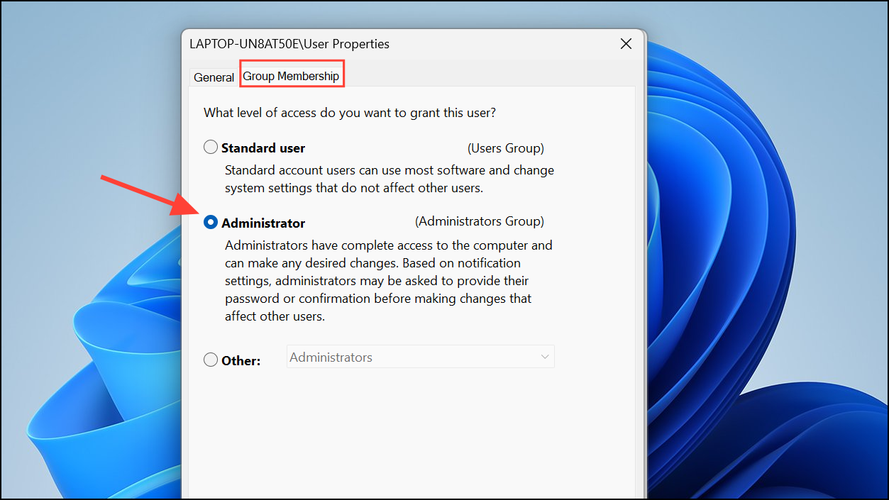Step 3: Go to the Group Membership tab. Ensure your account is set as Administrator. Click Apply, then OK, and restart your PC.