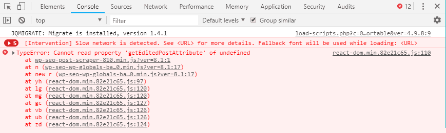To do so, we’ll fire up the Inspect tool in Chrome and go to the Console tab to see which scripts are blocking the block editor from loading.