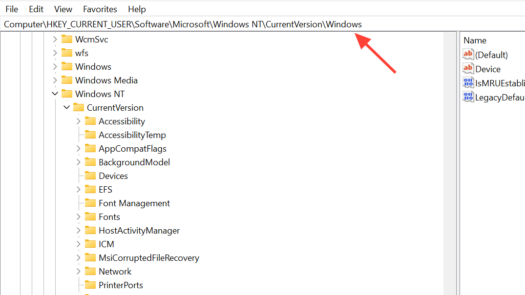 HKEY_CURRENT_USER\SOFTWARE\Microsoft\Windows NT\CurrentVersion\WindowsStep 2: If you prefer to navigate manually, expand these keys in the left pane in order: HKEY_CURRENT_USER → SOFTWARE → Microsoft → Windows NT → CurrentVersion → Windows.
