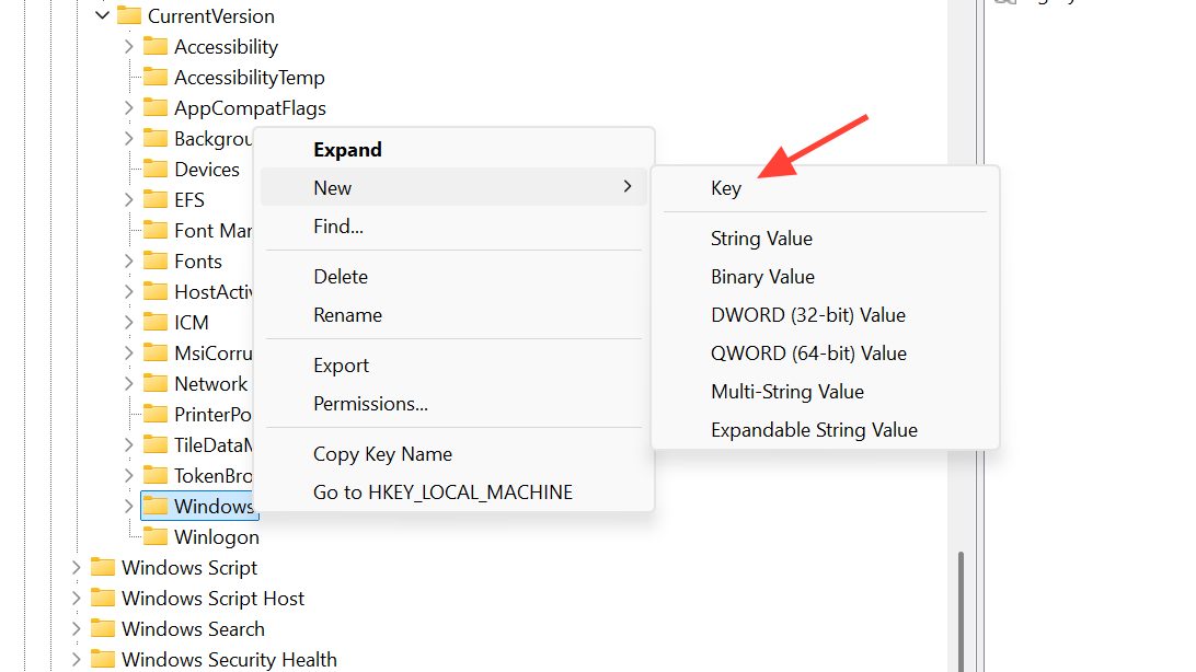 Step 1: Right‑click the Windows folder in the left pane and choose New > Key.
