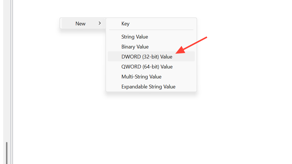 Step 2: In the right pane, right‑click an empty area and select New > DWORD (32‑bit) Value.