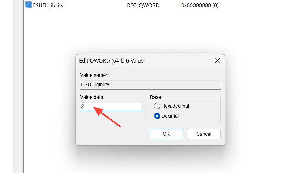 Step 4: Double‑click ESUEligibility, set “Base” to “Decimal”, and type 2 in “Value data” to indicate the device is eligible.