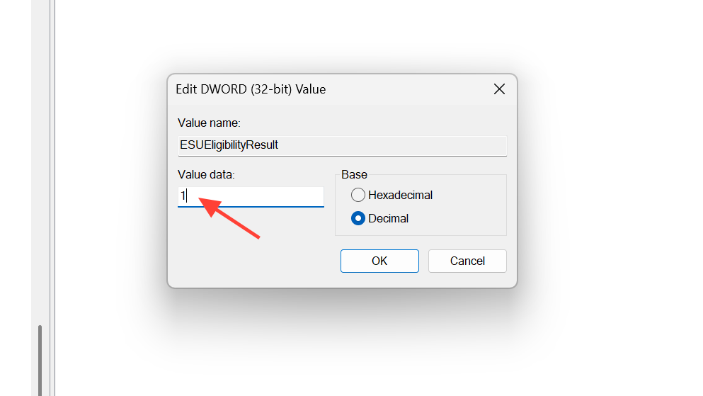 Step 3: Double‑click ESUEligibilityResult, set “Base” to “Decimal”, and type 1 in “Value data” to record a successful eligibility check.
