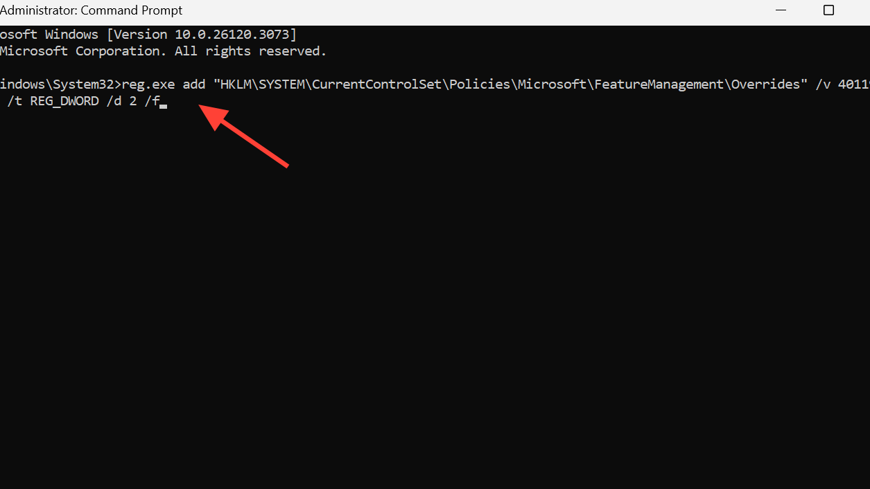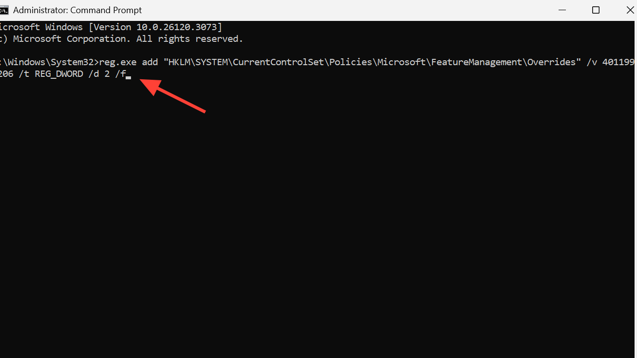 reg.exe add "HKLM\SYSTEM\CurrentControlSet\Policies\Microsoft\FeatureManagement\Overrides" /v 4011992206 /t REG_DWORD /d 2 /f