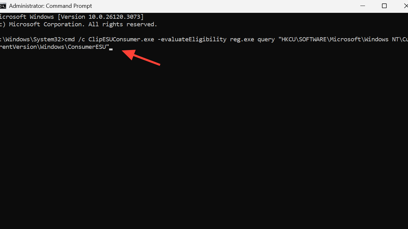 cmd /c ClipESUConsumer.exe -evaluateEligibility reg.exe query "HKCU\SOFTWARE\Microsoft\Windows NT\CurrentVersion\Windows\ConsumerESU"