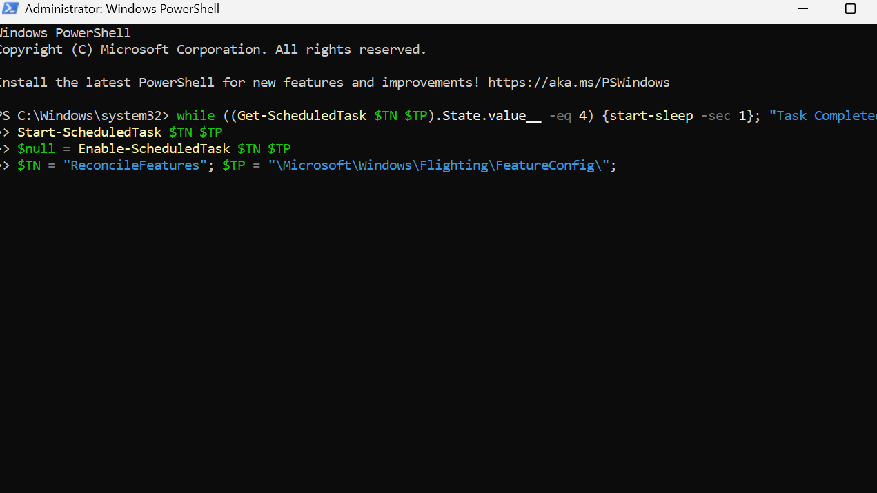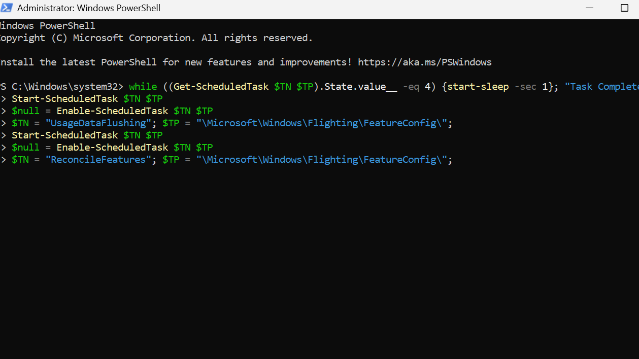 $TN = "ReconcileFeatures"; $TP = "\Microsoft\Windows\Flighting\FeatureConfig\";