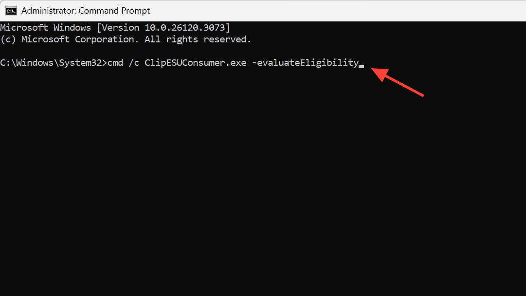 Some PCs do not respond to the simple ConsumerESU key alone because the internal Consumer ESU feature flag is off. This method uses built‑in command‑line tools to toggle the feature and evaluate eligibility.