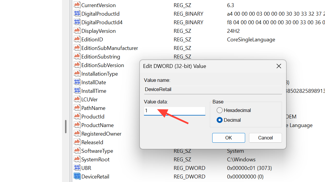 Step 4: Double‑click DeviceRetail and set “Base” to “Decimal”, then enter 1 in “Value data” to mark the device as a retail/consumer machine.