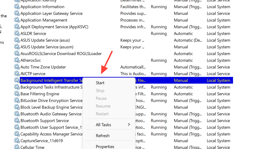 Step 3: Find “Background Intelligent Transfer Service (BITS)”, right‑click it, and select “Restart” as well.