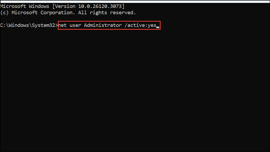 This command activates the built-in Administrator account, allowing you to proceed without a Microsoft account.