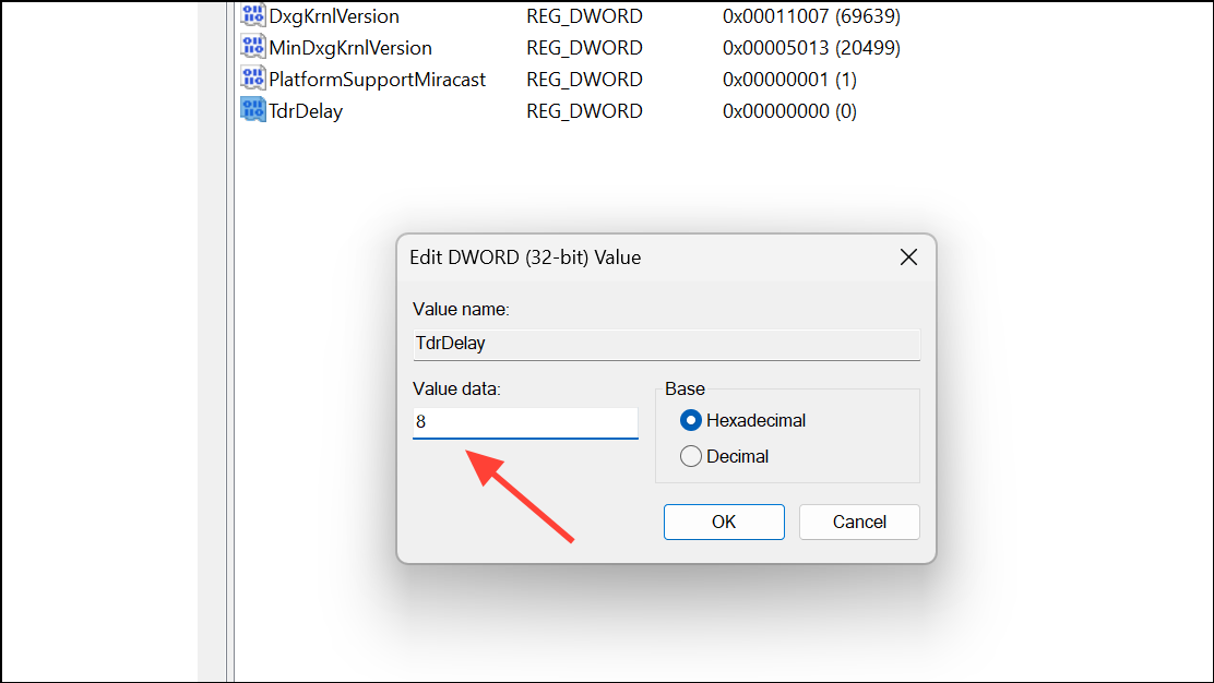 Step 4: Double-click TdrDelay and set its value data to 8. This increases the timeout to 8 seconds, allowing the GPU more time to respond before Windows resets the driver.