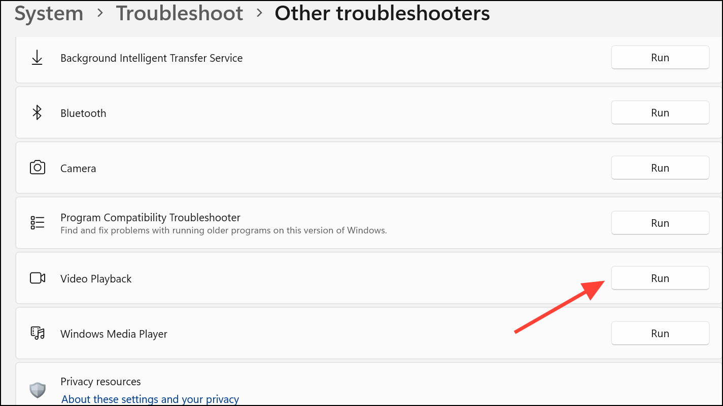 Step 2: Click Other troubleshooters and scroll to Video Playback. Click Run to launch the troubleshooter.