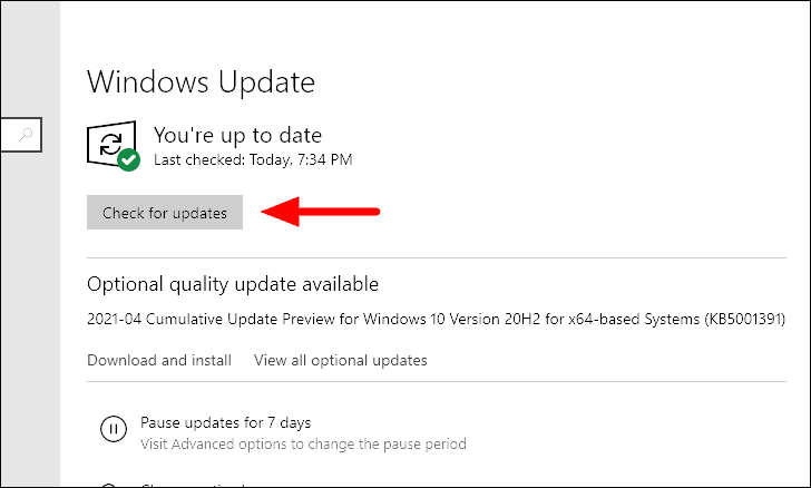 The ‘Windows Update’ tab will open by default since it’s listed first on the left. Click on the ‘Check for updates’ icon on the right to check if there are any available Windows updates. In case there is, Windows will start to download and install it on your system.