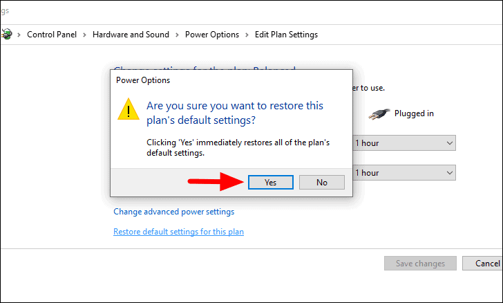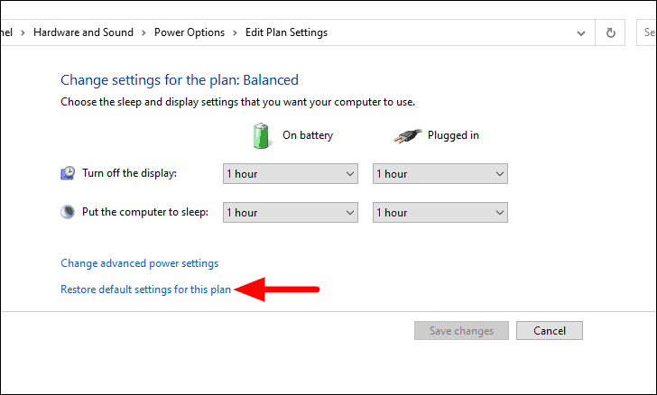 You will now see the current power plan and its settings. Next, click on ‘Restore default settings for this plan’ at the bottom.