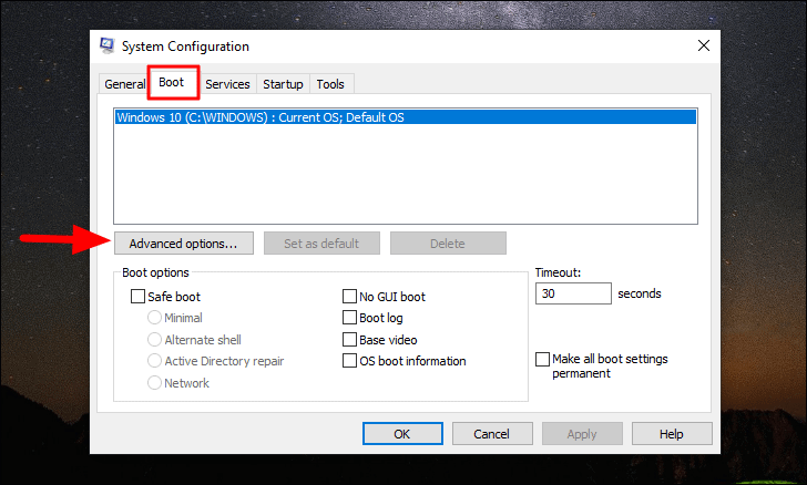 In the System Configuration window, select the ‘Boot’ tab at the top and then click on ‘Advanced options’.