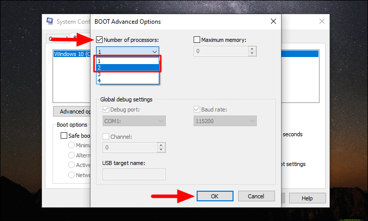 Next, tick the checkbox for ‘Number of processors’, click on the box under it, and then select either ‘1’ or ‘2’ from the drop-down menu. After you have changed the number of processors, click on ‘OK’ at the bottom to save the changes in the ‘BOOT Advanced Options’ window.