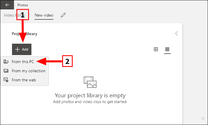 You now need to add videos to the project to lower their resolution. Click on ‘Add’ near the top-left corner and then select ‘From this PC’ in the drop-down menu.