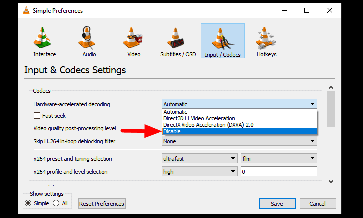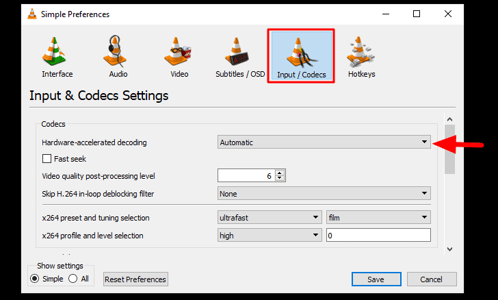 In the preferences window, switch to the ‘Input/Codecs’ tab from the top, and then click on the box next to ‘Hardware-accelerated decoding’.