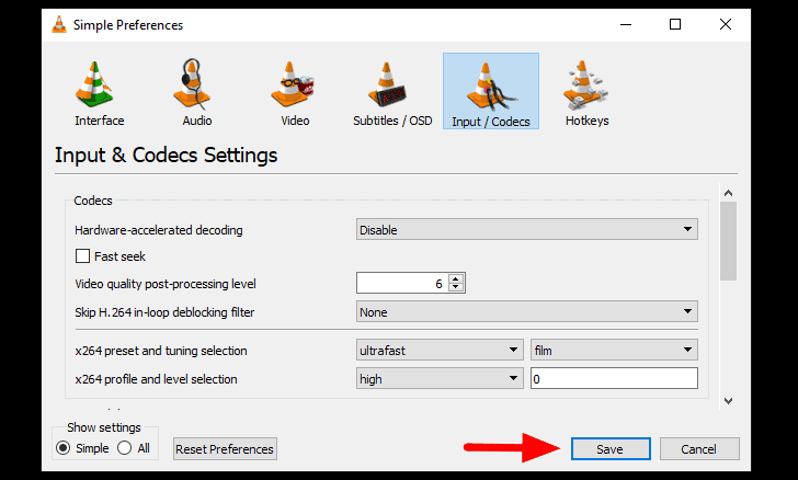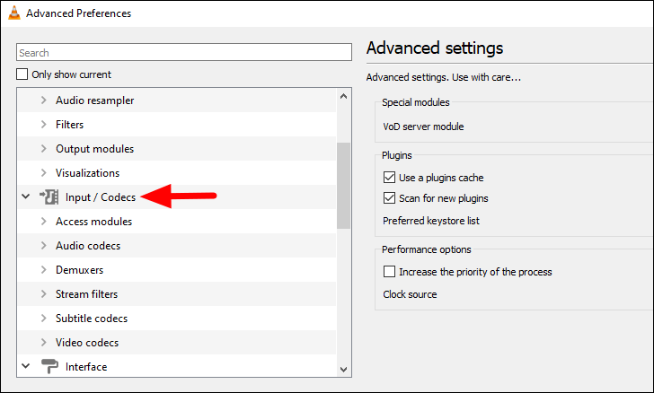 Next, select ‘Input/Codecs’ tab from the list of options on the left.