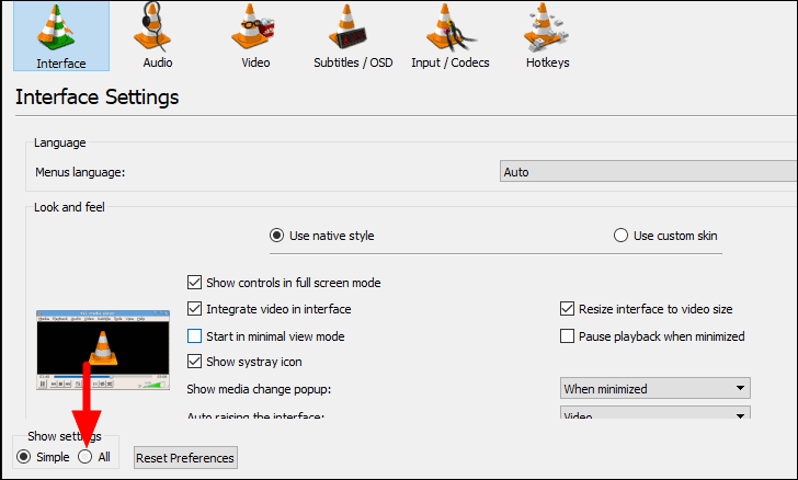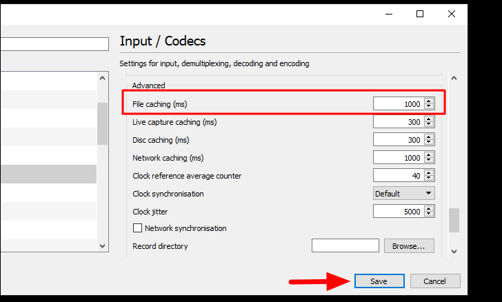 In the ‘Input/Codecs’ setting, scroll down to the ‘Advanced’ section, and then choose a lower value for ‘File caching’. Experiment with different values until the video playback error is fixed. After you have changed the value, click on ‘OK’ at the bottom.