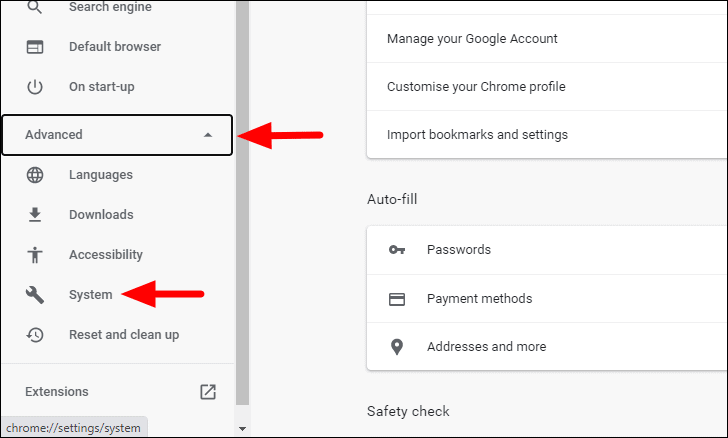 In the Chrome settings, click on the ‘Advanced’ option on the left and select ‘System’ from the drop-down menu.