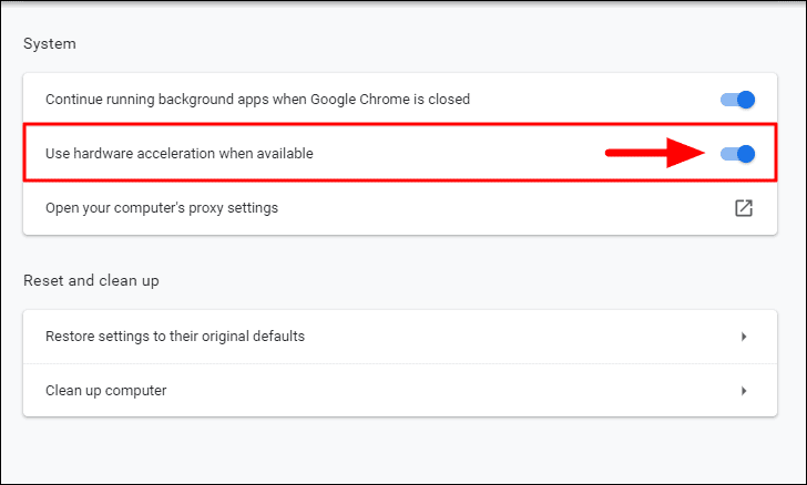 Next, click on the toggle next to ‘Use hardware acceleration when available’ to turn it off when enabled and turn it on when disabled.