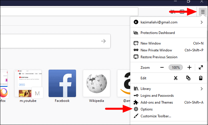 To modify the hardware acceleration settings in Firefox, launch the browser and click on the ‘Open Application Menu’ icon at the top-right. Next, select ‘Options’ from the drop-down.