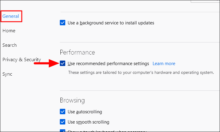 Now, the ‘General’ tab will launch by default, and click on the checkbox for ‘Use recommended performance settings’ under ‘Performance’ to view the options under it.