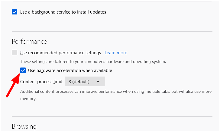 Next, click on the checkbox for ‘Use hardware acceleration when available’ to change its current status.
