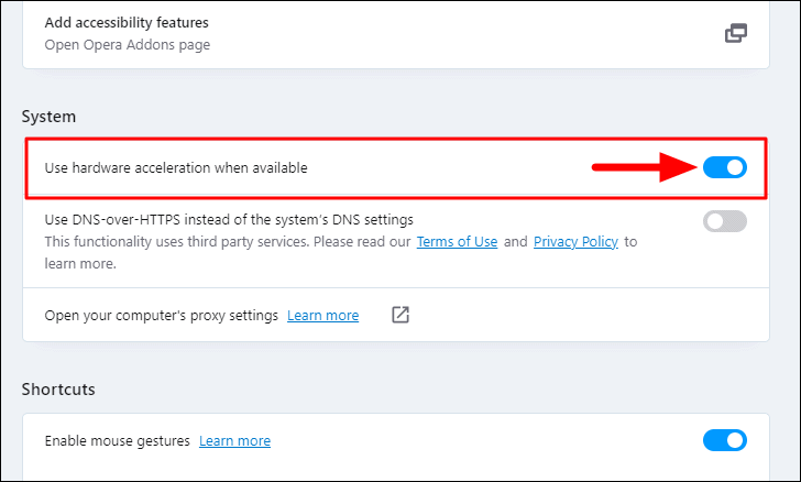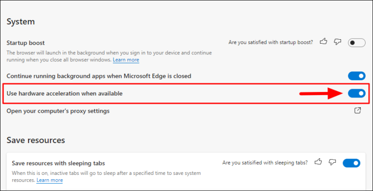 Scroll down and look for the ‘System’ section. Next, click on the toggle next to ‘Use hardware acceleration when available’ to change the setting.