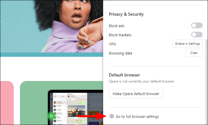 A drop-down menu will now appear on the screen, select ‘Go to full browser settings’ from the list of options.