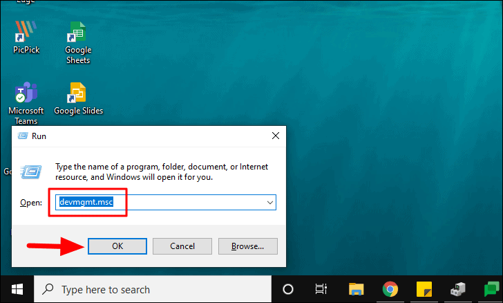 To scan for hardware changes, you first need to open the ‘Device Manager’. Press WINDOWS + R to launch the ‘Run’ command. Next, enter ‘devmgmt.msc’ in the text box and then click on ‘OK’.