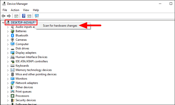Now, right-click on the device name at the top and then select ‘Scan for hardware changes’ from the menu.