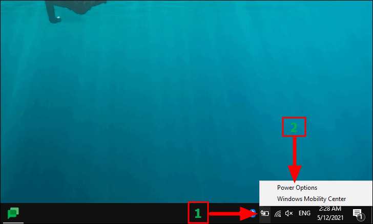 To restore default settings for the power plan, right-click on the battery icon in the system tray and then select ‘Power Options’ from the menu.