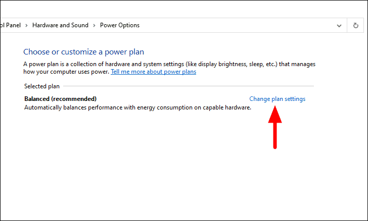 The ‘Power Options’ window will now launch. Now, click on ‘Change plan settings’ under the ‘Selected plan’ section.
