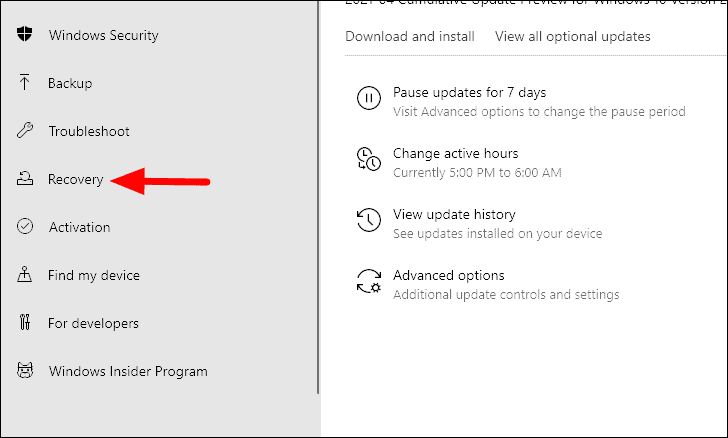 Next, select the ‘Recovery’ tab from the left.